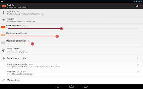 Co ciekawe aplikacją sama wie, kiedy zwiększyć natężenie filtra korzystając z zegara systemowego i robi to tylko w godzinach wieczornych i nocnych.
